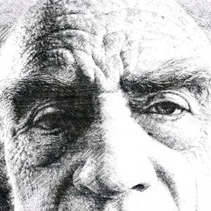 White hair with bushy eyebrows and wrinkles that make him look like he has been in the wind too long. Exceptionally rosy cheeks with a clean-shaven face except for hairs growing out of his nose and ears.