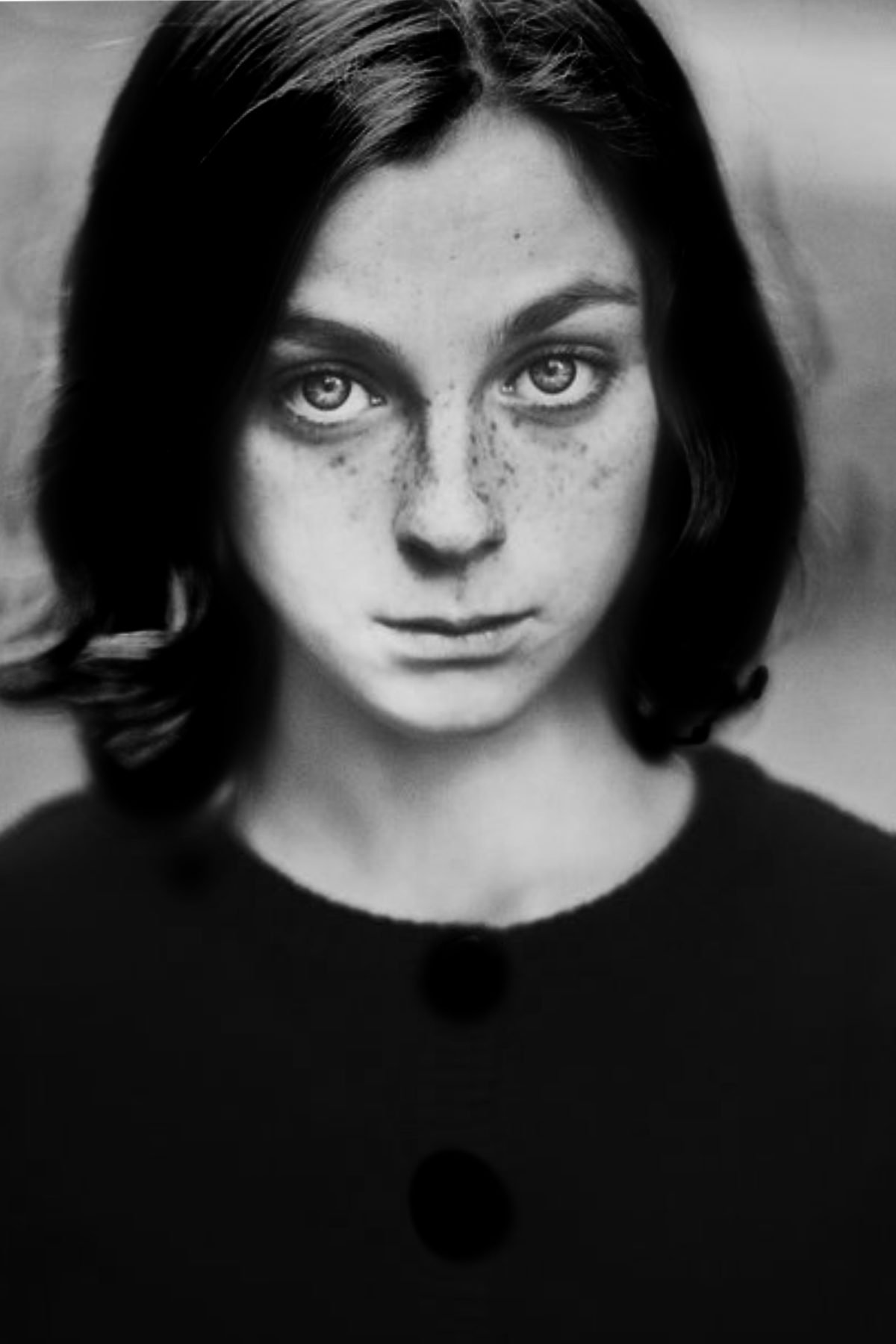 Shoulder-length black hair, white blue eyes, pale white skin, and freckles.